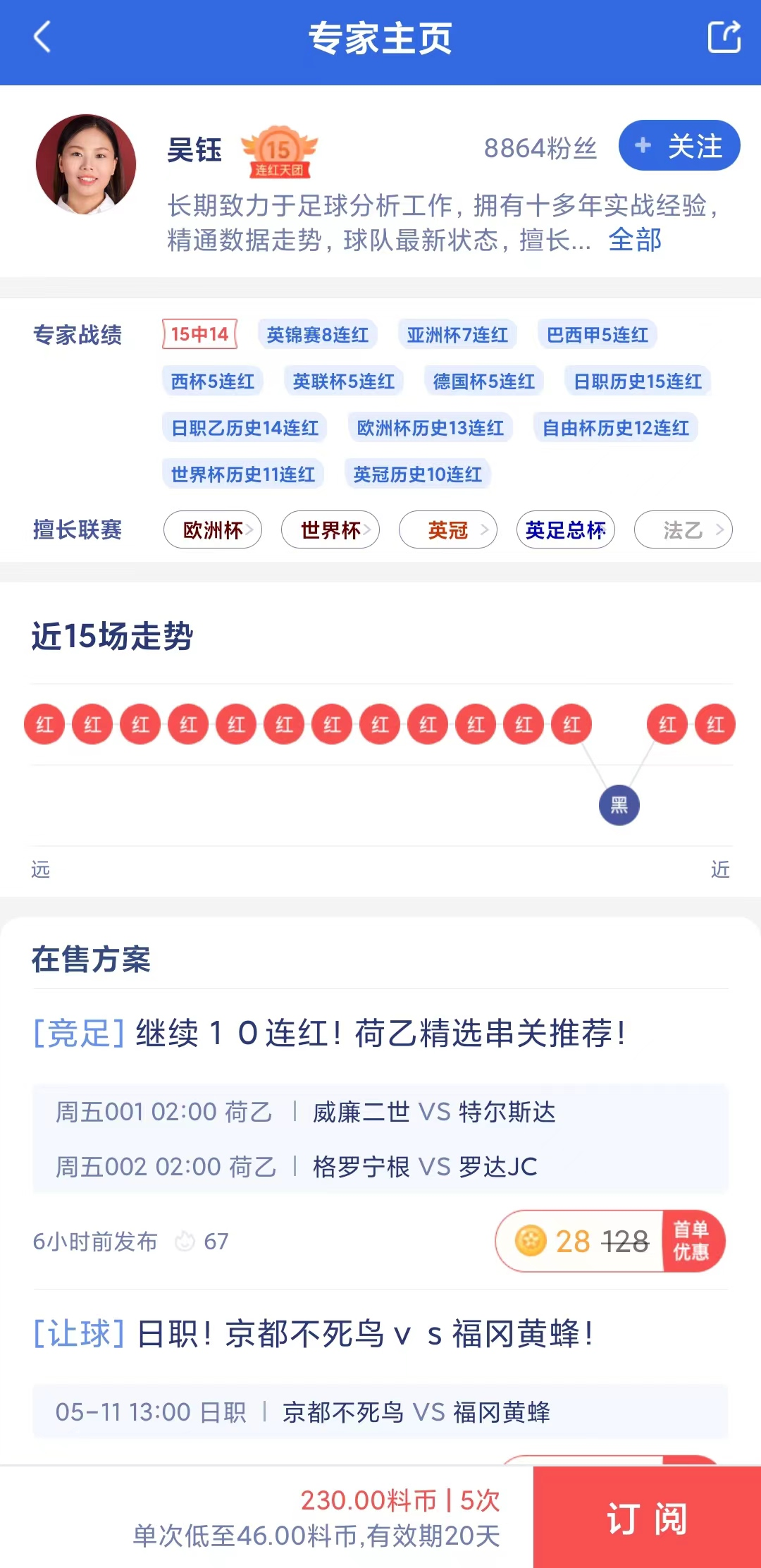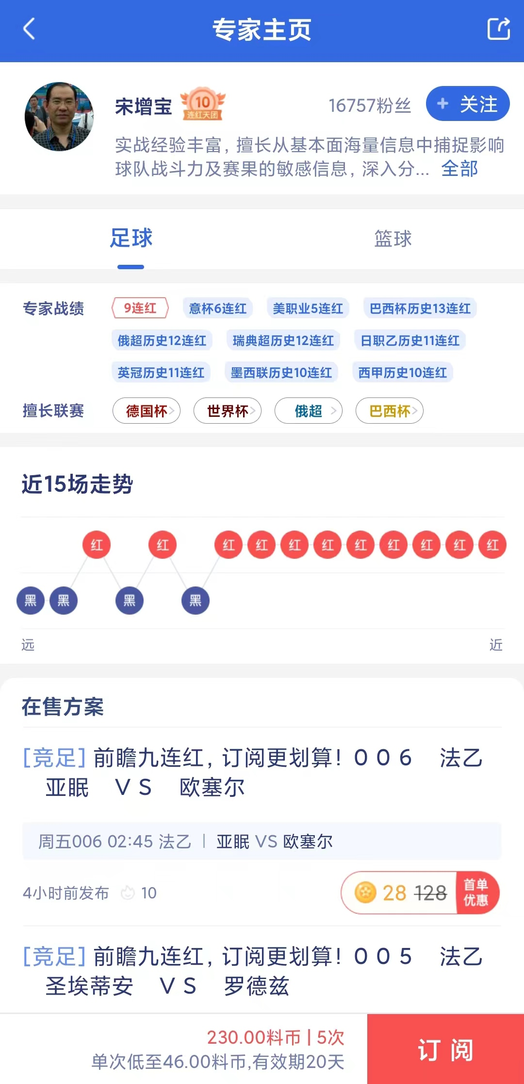 平台专家“宋增宝”状态不错,成功斩获9连红!该专家已经开通订阅功能,看方案更优惠。
