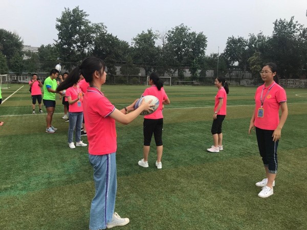 雨后球场,绿茵如毡。橄榄球运动员们不遗余力地奋力撞击、抢攻。而在场边,一群穿着粉红色上衣的青少年们,生疏地抛掷着手中的橄榄球。对他们来说,这项运动还很陌生。