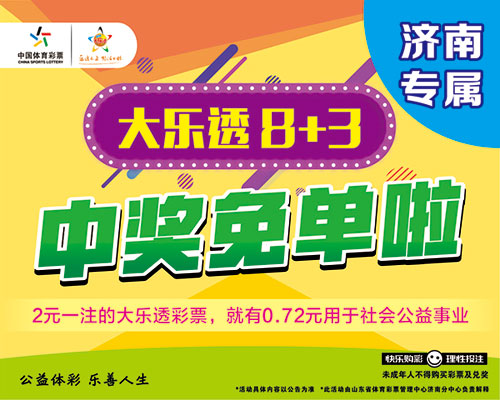 好消息!济南购彩者专属活动开始啦!济南“大乐透8+3中奖免单”活动从超级大乐透第19079期(2019年7月8日20:10开售)开始,凡在济南市(不含莱芜区、钢城区)实体销售网点(不含手机在线)采用“8+3”复式投注大乐透且中奖的,该张彩票中奖当期免单。多期票满足该条件的,按其活动期内中奖的期次进行免单。活动至270万元活动资金使用完后的下一期截止。