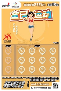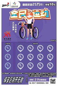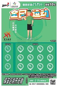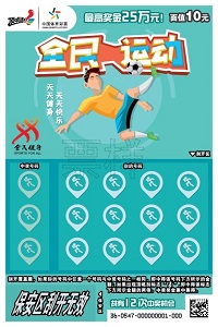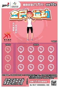 “全民运动”一套五张,单票面值10元,共有12次中奖机会,头奖25万元。五个票面分别为健身、跑步、骑行、羽毛球和足球,都是深受大众喜爱、普及率高的运动,通过卡通形象的展示,传达阳光、活泼、正能量的信息。通过票面主形象中运动健身的漫画人物表现“全民健身”主题,风格轻松愉悦。主色调采用清新、活泼的颜色,使整个票面更清新、时尚。