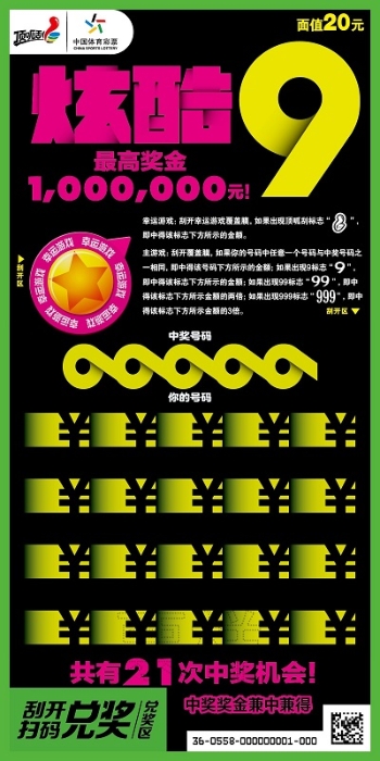 近日,一款既好玩又炫酷的顶呱刮新票“炫酷9”在全国各地陆续上市销售。“炫酷9”单票面值20元,共有21次中奖机会,最高奖金为100万元。