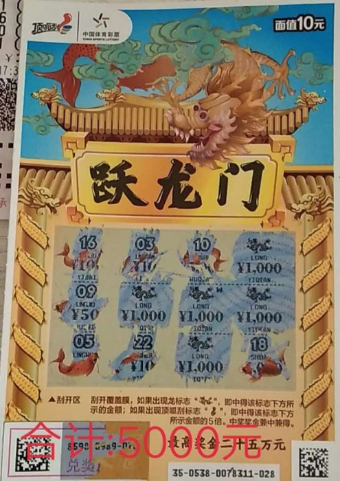 同在抚州,同是5月20日,资溪县的宋先生把中得的体彩顶呱刮“跃龙门”奖金5000元给了妻子,以表达节日的祝福。宋先生下班时路过资溪县建设中路69号13107体彩网点,他看到玻璃门上贴着的即开新票“跃龙门”的活动海报,便走进网点,买了10张试手气。刮到第三张时,宋先生刮出了五条龙,他心里一动,感觉会中奖,便赶快刮开奖金区的覆盖膜,结果惊喜地出现,每条龙下面显示的奖金都是1000元,这张10元面值的“跃龙门”中得奖金5000元。