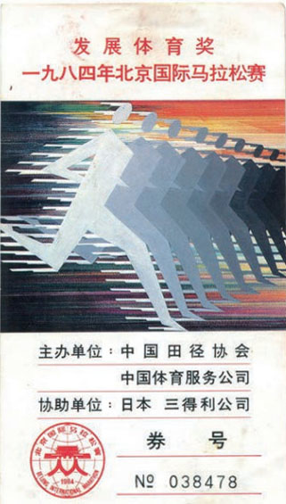 北京国际马拉松赛奖券,自1984年至1994年共发行了11期,除1984年是竖式外,其余均为传统型,正面印有运动员赛跑图、会徽、主办单位、协办单位等信息,背面印有广告。北京首期马拉松彩票是新中国的龙头体育彩票,应该说是彩票中的“珍品”,极具收藏价值。