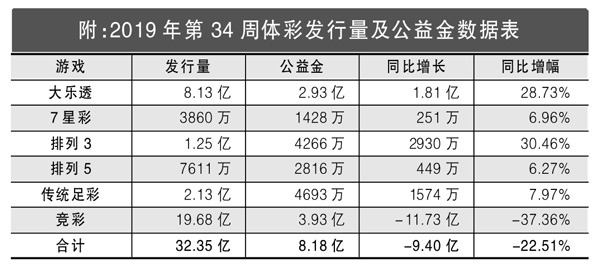 8月19日至25日,体彩全国联销游戏(大乐透、7星彩、排列3、排列5、传统足彩、竞彩)通过32.35亿元的发行量,筹集了8.18亿元公益金。当周发行量比去年同期减少9.40亿元,同比降低22.51%。当周共开出13注500万元及以上大奖,其中体彩大乐透11注,7星彩2注。当周同比发行量减少部分全部来自竞彩。