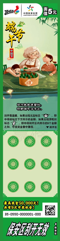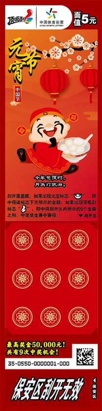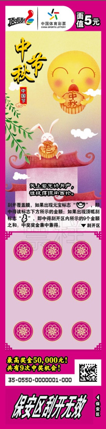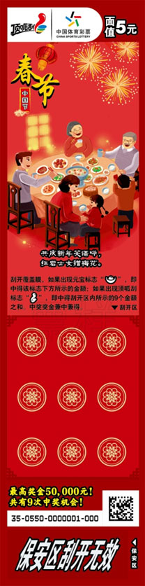 目前,即开型体育彩票顶呱刮“中国节”正在全国各地陆续上市销售。该款彩票一套七张,单票面值5元,头奖5万元。