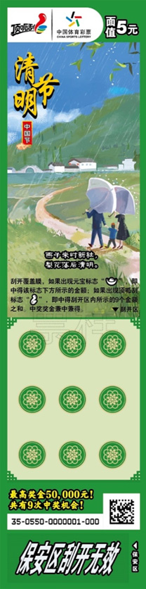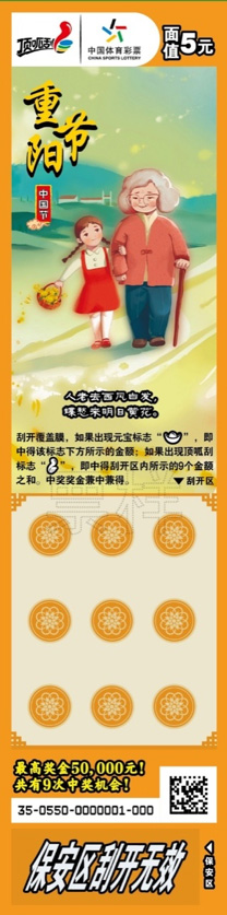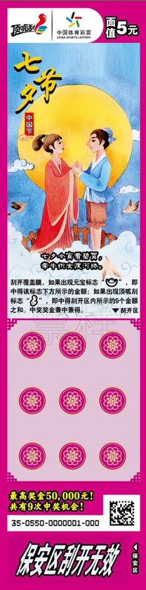 体彩顶呱刮之前发行过多种文化类主题彩票,尤其是每年春节期间,都会发行生肖票、年票等。不过,像本次这样把春节、元宵节、清明节、端午节、七夕节、中秋节、重阳节等具有中国传统文化特色的节日“一网打尽”还是首次。该款套票通过中国传统节日丰富的内涵,彰显了深厚的文化底蕴,并向购彩者传达出团圆、思念、亲情等情感,每个票面上都有一句应景的诗文,更加透露出浓浓的文化气息。
