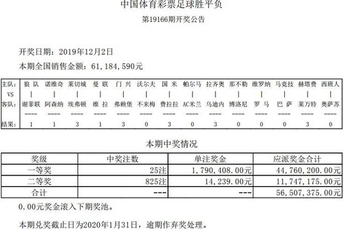 北京时间12月2日,足彩胜负彩第19166期开奖结果揭晓。本期14场胜负彩头奖中出25注,单注奖金1,790,408元;二等奖中出825注,单注奖金14,239元;任九中出2,876注5,219元。