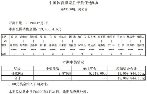 本期14场胜负彩投注总额为61,184,590元,任九投注总额23,456,416元。本期兑奖截止日为2020年1月31日,逾期作弃奖处理。
