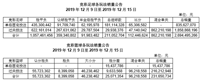 竞彩一周销量公告(12月9日-12月15日)