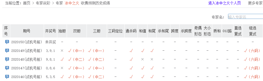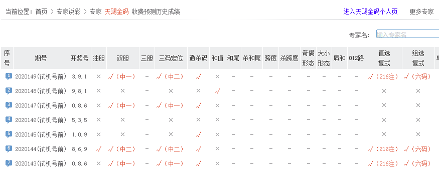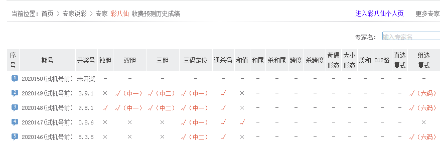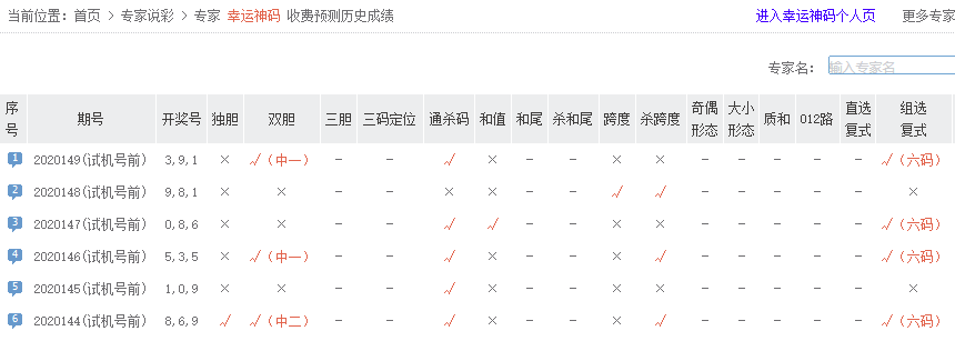 中彩红手五码复式预测命中,金胆、和值等多项预测均命中,夺得3D149期预测排行榜首。