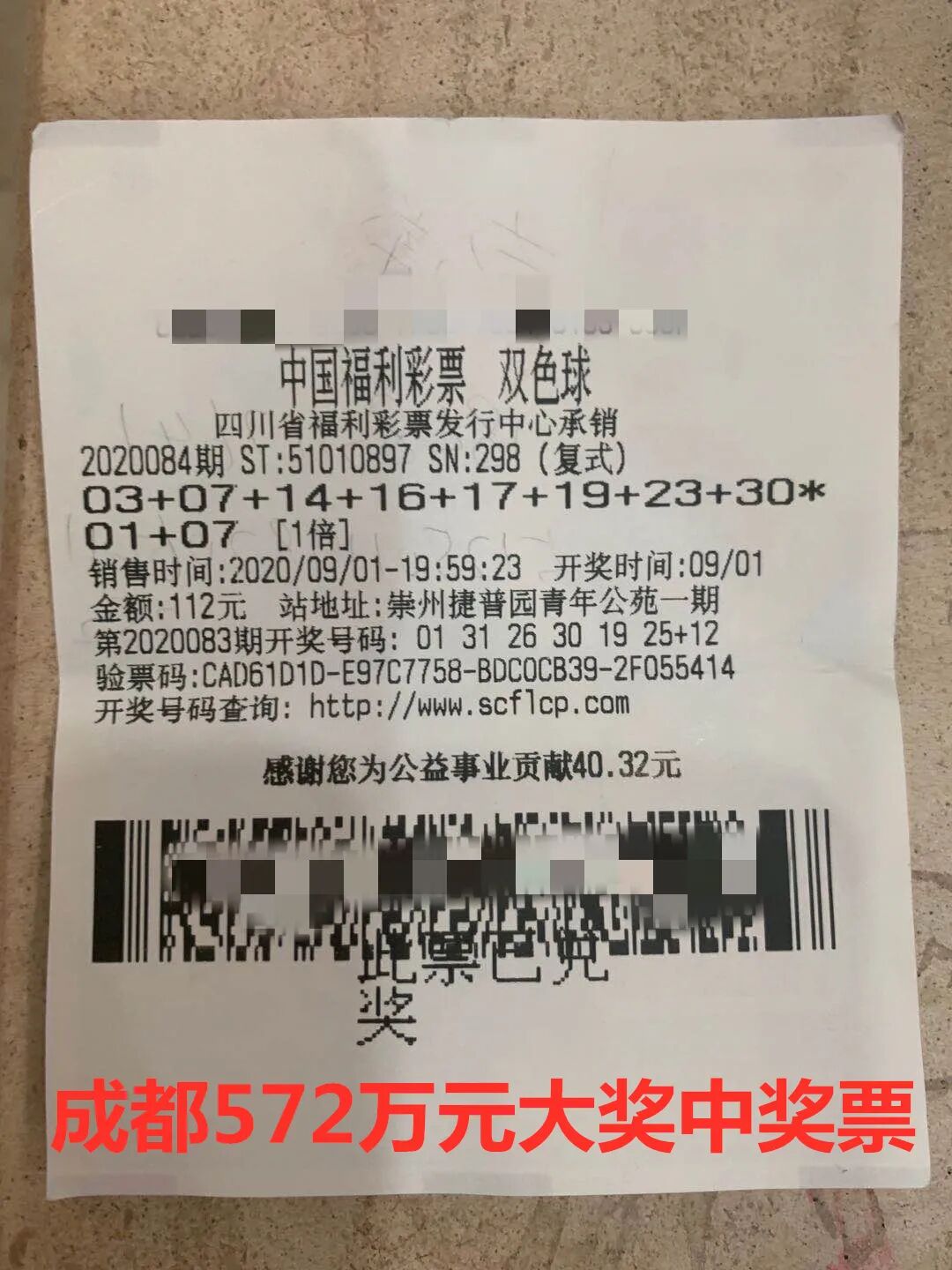 9月1日晚,双色球第2020084期开奖,开奖出红球号码03、07、16、17、23、30,蓝球号码07,我省成都市崇州捷普园青年公苑一期A区10-5号51010897号投注站32位彩民合买喜中当期一等奖,凭一张“8+2”的复式票一举拿下总奖金572万元,为四川彩民赢得九月“开门红”!值得一提的是,这不仅是四川彩民今年中得的第四个双色球合买一等奖,更是成都历史上第一个合买一等奖!