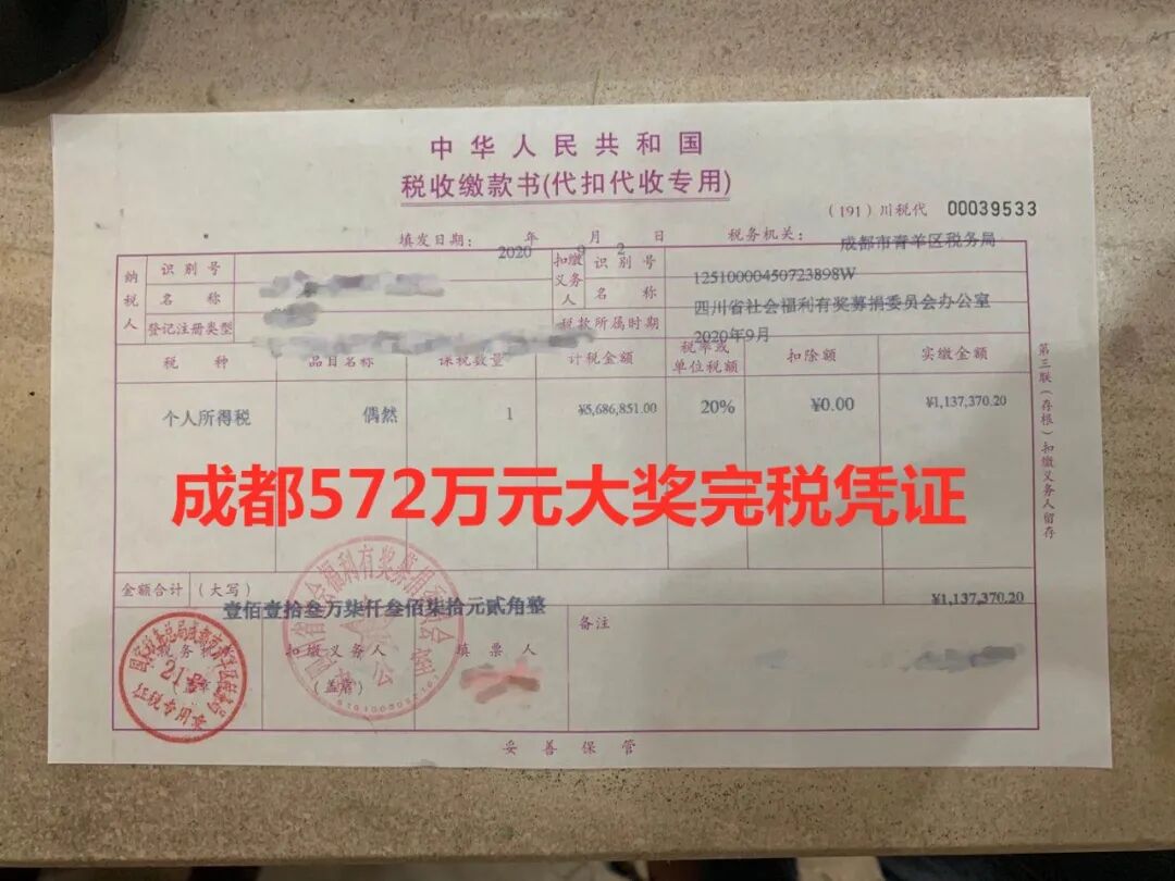 图片说明:成都572万元大奖中奖票、完税凭证