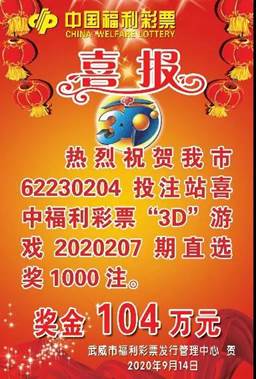 众人拾柴火焰高,集思广益出精彩!9月12日,福彩3D游戏第2020207期开出号码“234”,开奖结果一出,位于甘肃省武威市凉州区姑臧路今朝一区东大门对面62230204号站点传来大奖喜讯,十位彩民通过合买方式擒获福彩3D游戏奖金104万元,一举摘得截至目前武威市单期3D大奖奖金之最!