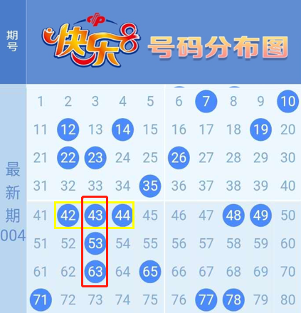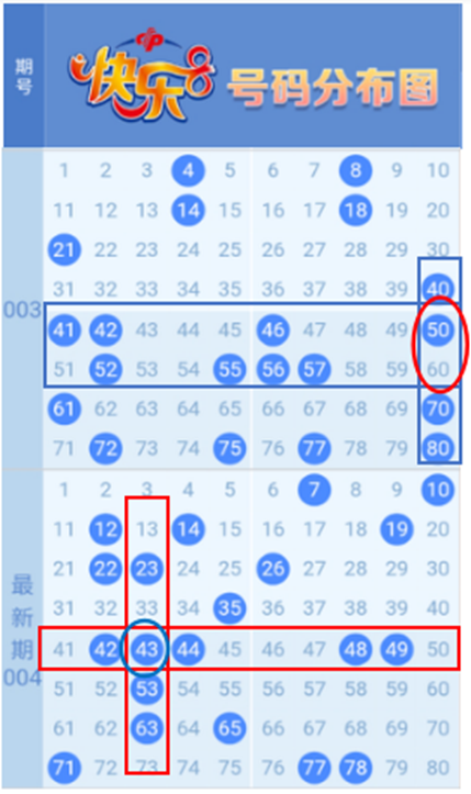 2、 上期的连号号码为:本期连号开出最大横连42 43 44;最大竖连 43 53 63。重点解释一下方格图的连号规则,方格图分为横连号和竖连号,在一行中连续的开出号码称为横连号,在一列中开出的连续相同尾号的号码称为竖连号,在最多出号的行或列中,都大概率会存在横连号和竖连号,只要圈定了最多出号行列,在这些行列里面选择连号进行购买将会非常易分析易中。连号请参考中彩网app内连号重号走势图 。