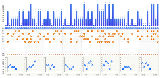 6、 全局分析:仅在中彩网有此20期单码出号次数统计,专家仅从此图上给大家以选号思路建议,不给出具体号码,大家可以根据上面的单个指标的以及本图做出选号判断。最下方为各行八期的出号个数变化,我们可以先从号码个数的变化圈定最热的出号行,并在行中根据单个号码的热力图选出最有可能开出的号码,并将自己的预测结果带入到下方的走势图中进行验证是否符合大方向和规律。