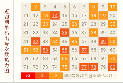 1、 热力图分析:截止上期最热号码前五分别为14,35,42,49,53,已有过半号码标有颜色,较热区域可看出为第3区和第4区,在此两区内选号更易命中。热力图颜色即较深又带下划线号码开出更频繁,可较多关注。