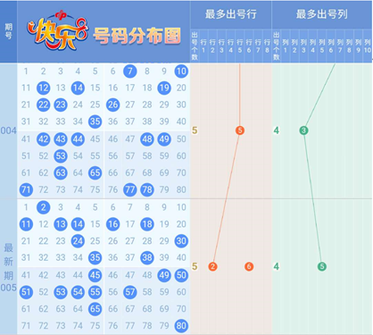 2、 最多出号行列分析:上期最多出号行为第2行和第6行,都开出5个号码,最多出号列为第5列,开出4个号码,且是竖的4连号。最多出号行列是用来大致圈定可能会开出最多号的行和列,一旦选对,一般这行这列会共开出7、8个及以上的号码,对于冲刺选8选9选10玩法极有帮助。