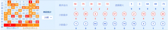 3、 重号号码分析:上期重号为30,34,58,72,75,80,一共开出6个重号。一般来说,每期与上期的重号都能达到3个左右或以上,重号经常是热号重复开出,可以多关注最多连出的号码,连出号码的总个数即是重号的个数。
