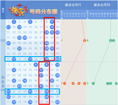 2、 最多出号行列分析:上期号码行列分布较均匀,每行均开出2-3个号码,每列均开出1-3个号码,第1列、第7列和第8列开出二连号。最多出号行列是用来大致圈定可能会开出最多号的行和列,一旦选对,一般这行这列会共开出7,8个及以上的号码,对于冲刺选8选9选10玩法极有帮助。