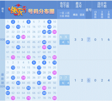 5、 最多出号分区分析:上期最多出号分区为第2区,开出7个号码,快乐8方格图可以将整个画面上的号码四等分,左上角20个号码成为第一区(包括1-5,11-15,21-25,31-35),其它类推,通过四分区80个号码可以看出各区的出号个数规律,从而圈定出号最多的区,在其中选择号码会更容易开出。另外,还有一种两分区分区方式,将1-40号码球分为小号区,41-80号码球分为大号区,从小号大号的出号个数规律可以圈定在哪个区选号会更容易命中。