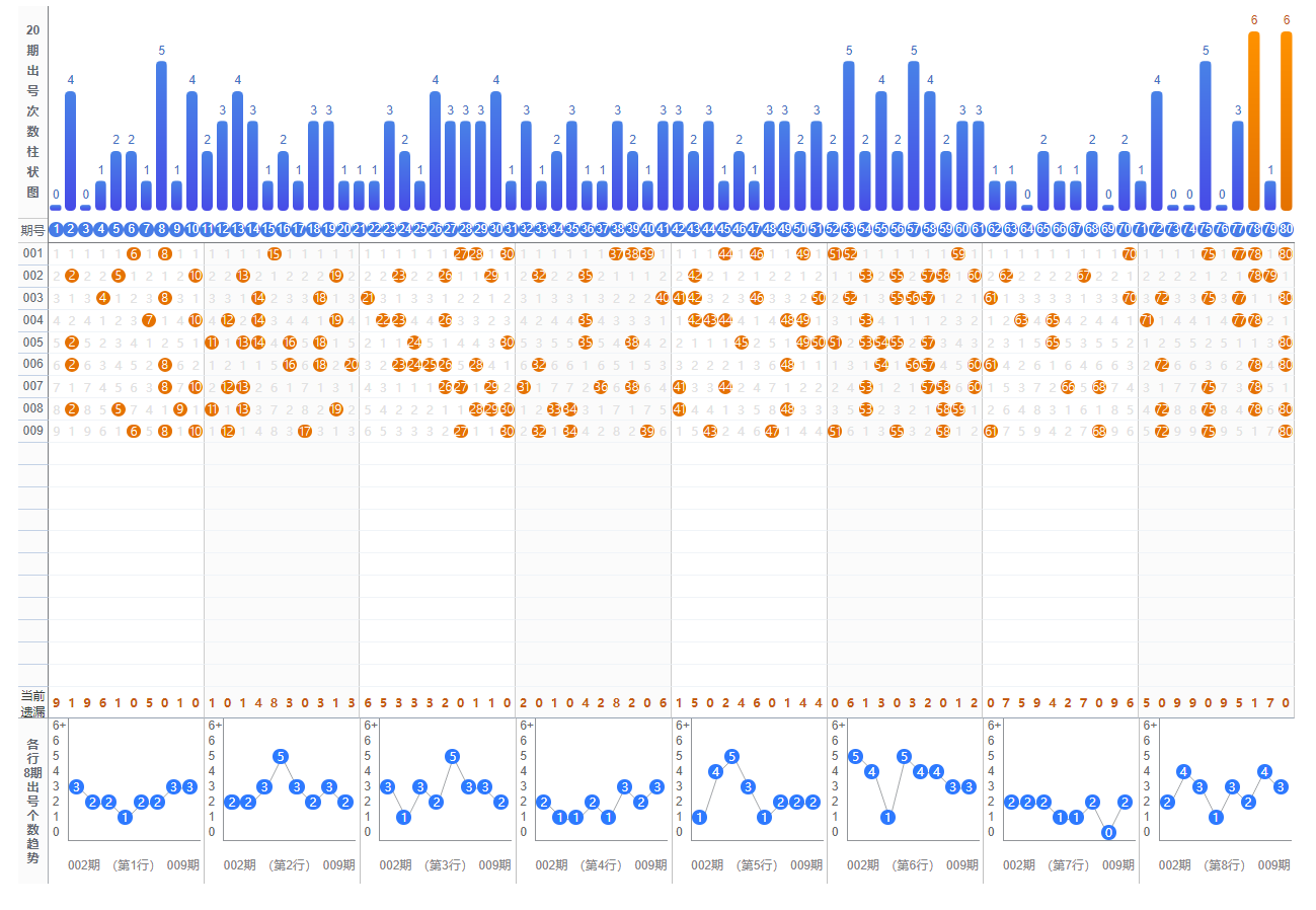 Ø 网站参考图表:综合分布图、20期号码统计图、全局80号码分布可在快乐8走势图表中可查。