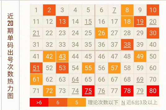 1、 热力图和重号分析:截止上期最热号码前五分别为75,78,80,2,10,热力图次数门槛再次提升后排前五的仍旧是这几个号,而这些号最近又不常出,因此选号时反而可以避开这些热号,去找下划线的号码。
