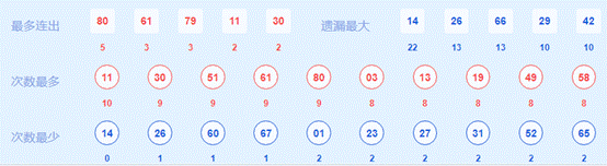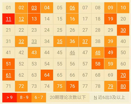 1、 热力图和重号分析:截止上期最热号码前5分别为11,30,51,61,80.热力图首次出现20期出9次的号码11,另外,30,51,61第二阶梯的号码也有可能冲刺9次以上。