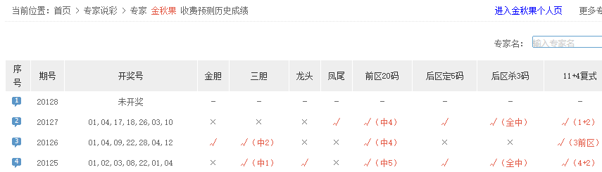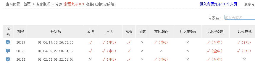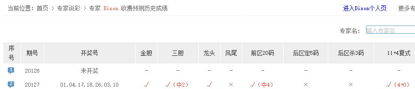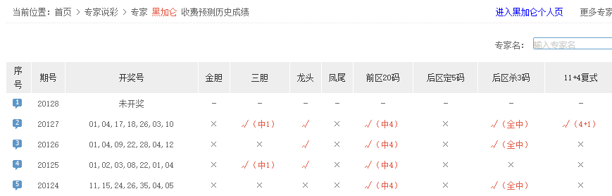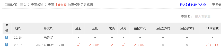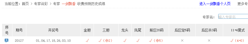 一剑飘香大乐透命中5前区,11+4命中4+0。
