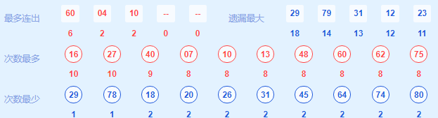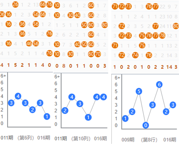 3、 最多出号行列分析:本期选出如上三个可能会开出最多出号的行和列,我们可以找稳定出号较多的行列,也可以找号码变化较大的行列。最多出号行列一旦圈定,会在里面开出8个以上的号码。