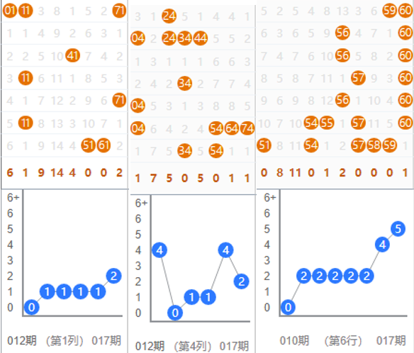 3、 最多出号行列分析:本期选出如上三个可能会开出最多出号的行和列,我们可以找稳定出号较多的行列,也可以找号码变化较大的行列。最多出号行列一旦圈定,会在里面开出8个以上的号码。