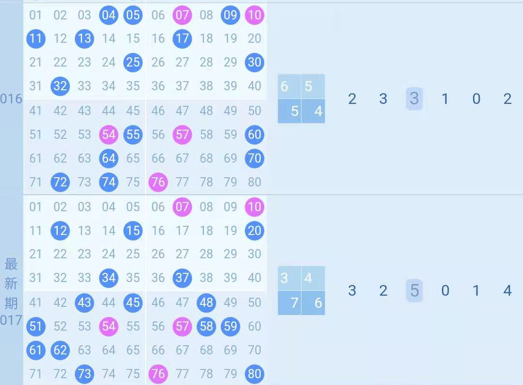 (专家【老周】:本期看好第1列及第4列出最多号,预计共出7个及以上,21,34,54,有较大开出可能。 对擂专家:本期看好第6行开出最多号,请关注51,53,57。)