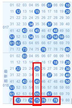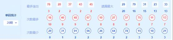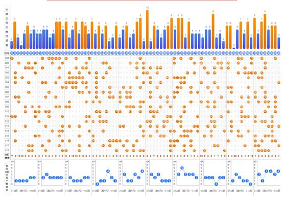 3、 最多出号分区分析:上期最多出号分区为第3区,开出8个号码,开出最多号码区的号码还有另外一个作用,就是用来排除号码用,一般的,某一区上期开出的号码基本上不带入下一期,因此,可以把上期开得最多的号码的区的号码作为杀号号码。例如下期就不要去选73、74、75这样的连号。