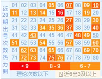 1、热力图和重号分析:截止上期开出最多的前五个号码为16/40/48/07/10,热力图颜色较多的区域为第二区,第2行、第10列颜色较多,可在此两列多多选号