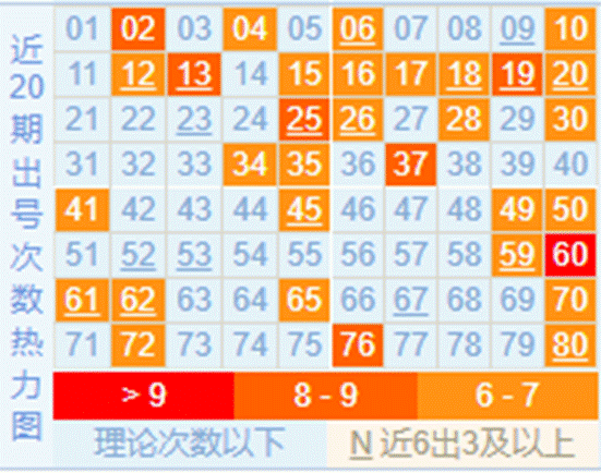 1、热力图和重号分析:截止上期最热号码前5分别为60,13,2,19,37。号码60已经在近20期内开出10次,几乎平均两期一出,热号为重号的概率非常大,大家可多用热号来组重号。