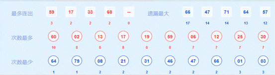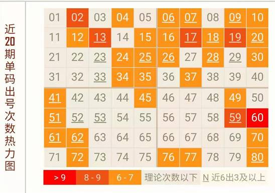 1、热力图和重号分析:截止上期最热号码前4分别为59,17,33,6。号码60已经在近20期内开出10次,几乎平均两期一出,热号为重号的概率非常大,大家可多用热号来组重号。
