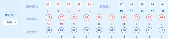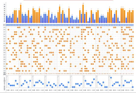 3、 最多出号分区分析:上期最多出号分区为第3区,开出7个号码,开出最多号码区的号码还有另外一个作用,就是用来排除号码用,一般的,某一区上期开出的号码基本上不带入下一期,因此,可以把上期开得最多的号码的区的号码作为杀号号码。例如下期就不要去选61、62、63这样的连号。