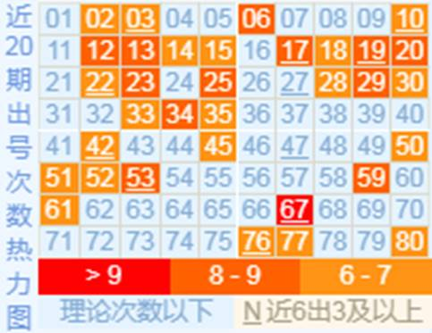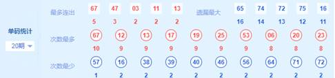 1、热力图和重号分析:截止上期最热号码前5分别为67,12,13,17,19。号码67,12已经在近66期内开出25次,几乎平均两期一出,热号为重号的概率非常大,大家可多用热号来组重号。
