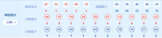 2、最多出号分区分析:上期最多出号分区为第1区,出了6个号码,第4区号码出号重号增多,可重点关注。