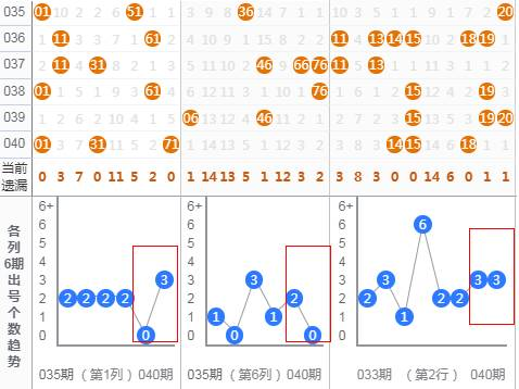 3、 最多出号行列分析:本期选出如上三个可能会开出最多出号的行和列,我们可以找稳定出号较多的行列,也可以找号码变化较大的行列。最多出号行列一旦圈定,会在里面开出8个以上的号码。