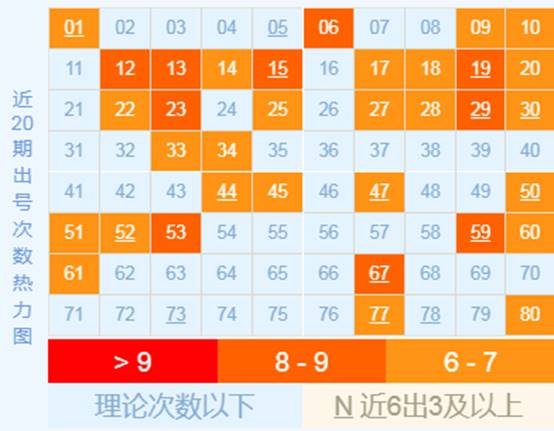 1、热力图和重号分析:截止上期最热号码前5分别为06,15,19,29,59。号码06,15已经在近66期内开出25次,几乎平均两期一出,热号为重号的概率非常大,大家可多用热号来组重号。