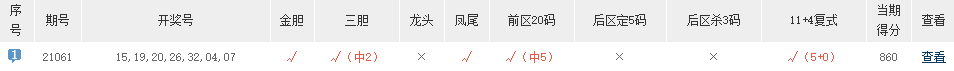 5月31日晚,大乐透第21061期开奖,开奖号码为前区15 19 20 26 32 后区04 07。最新方案访问http://www.cmzj.net查看】