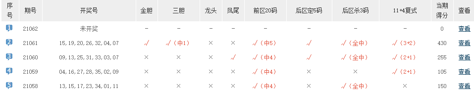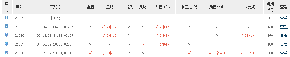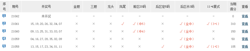 龙舞、红豆南国、陈刀仔、我是大闸蟹、老钟选彩大底命中5+2。