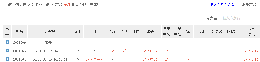 龙舞12+4命中5+1;预测小仙、彩金猎人、陌小歪、铁血丹心、天之命、鱼咬金、金秋果、大门胆王、zgeng00001、云长说彩、老八看彩、福彩师命中5红1蓝。