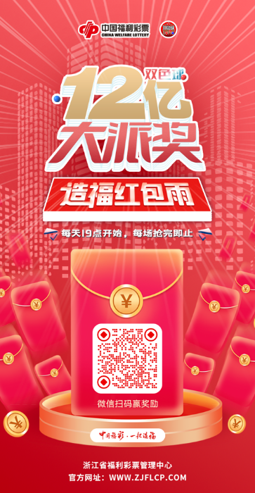 福彩双色球,为梦造福。中国福利彩票“双色球”游戏自2003年2月16日上市以来,已陪伴广大公众走过了18个春秋,今年又一次双色球大派奖活动如约而至,派奖12亿,大奖小奖奖金都翻番,单注最高可中2000万元,一场“超级造福节”拉开帷幕!为回馈大家的支持与厚爱,浙江福彩准备了“双色球12亿大派奖有奖互动”双重惊喜:11月15日起,参与浙江福彩“造福红包雨”、“合成‘12亿’”线上有奖互动活动,共计60万元好礼福利大放送,一起来开启幸运,超级造福吧!