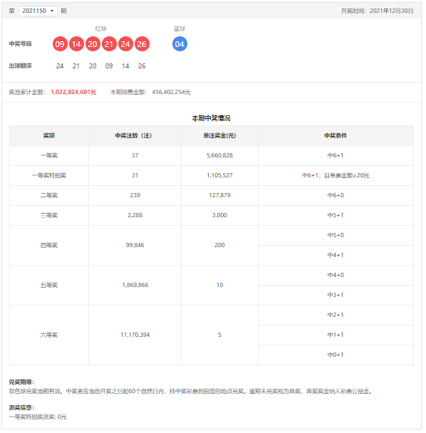 双色球第2021150期开奖号码公告