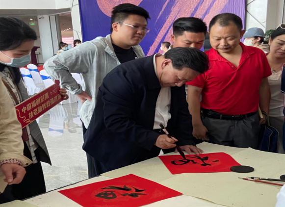 5月14日上午,在湖南省中青年书法大展现场,湖南省福利彩票发行中心组织开“写‘福’字•送福彩”活动,引来众多省内知名书法家、书法爱好者们泼墨挥毫,热心参与。