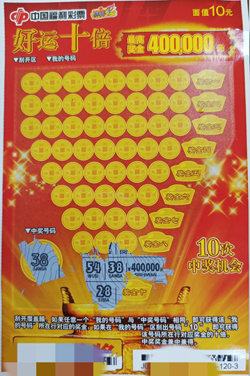 “这一次的运气实在太好了,原先最多只刮出过50元的小奖。”小牛说,5月16日,他同往常一样来到福彩投注站,在刮刮乐销售柜前,他一眼就看中了这款颜色喜庆的“好运十倍”,经销售员介绍得知该票种正在派奖,便买了5张,打算试试手气。没想到这随便一试,好运就降临了,在刮开其中一张彩票时,小牛一眼就看到了中奖号码“38”出现在了我的号码区域中,而后方对应奖金栏中的“¥400000元”奖金字符让他瞬间感到一阵狂喜。