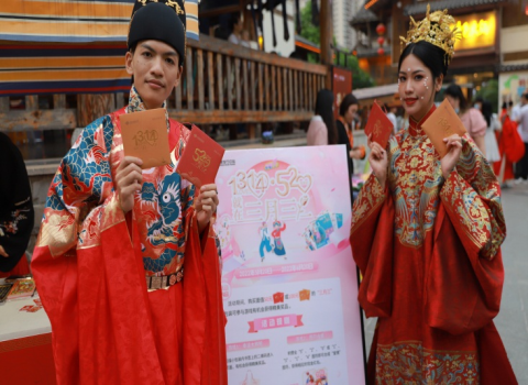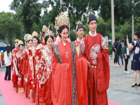 2022年5月20日,地铁场景520汉式公益婚礼在广西壮族自治区首府南宁市隆重举行。来自全区各地的28对新人在社会各界的祝福与亲友嘉宾的见证下,搭乘南宁地铁1号线520汉式公益婚礼主题专列,经停会展中心站、民族大学站,在相思小镇完成婚礼仪式,幸福携手,并肩步入婚姻殿堂。