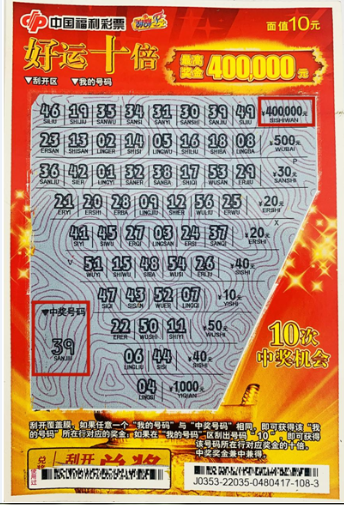 无独有偶,彩友小刘(化姓)也是顺路购彩中了刮刮乐头奖。据小刘自述,5月13日,他去瓦房店炮台检车,看到附近的556号福彩站点,便进去买几张刮刮乐。开始他刮了两张,中了10元钱,就又买了一张面值10元的“好运十倍”,就是这样,惊喜从天而降,喜中头奖40万元。
