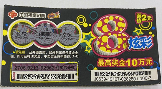 据21090073号站主介绍,刘先生是刮刮乐的忠实粉丝,尤其对5元、10元的刮刮乐情有独钟。当天他顺手买了几张2元“炫彩8”,刮开刮奖区时,“¥100000”的字符映入眼中,刘先生觉得像做梦一样,直到办完兑奖手续,才相信这是真的。